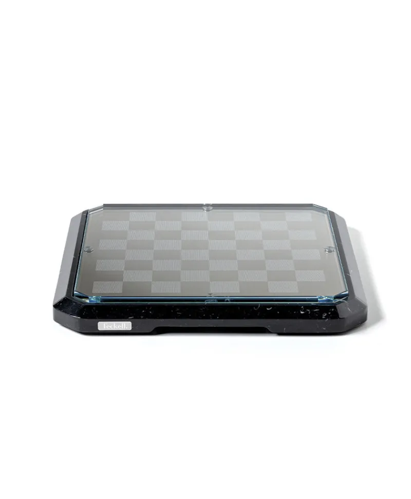 - Schachfiguren: aus gedrehten, extraklaren Zylindern aus Borosilikatglas – verziert mit 24-Karat-Gold und verchromtem Messing