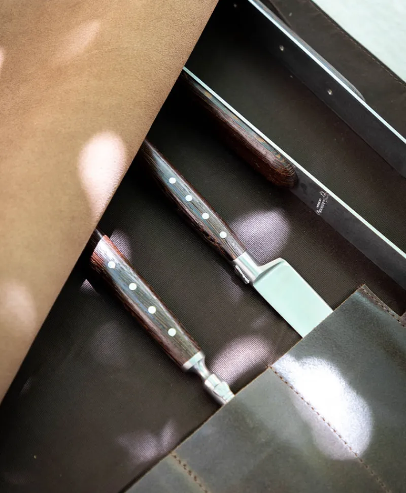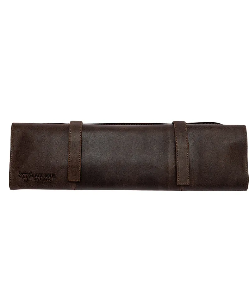 - aufbewahrt in einrollbarer Ledertasche