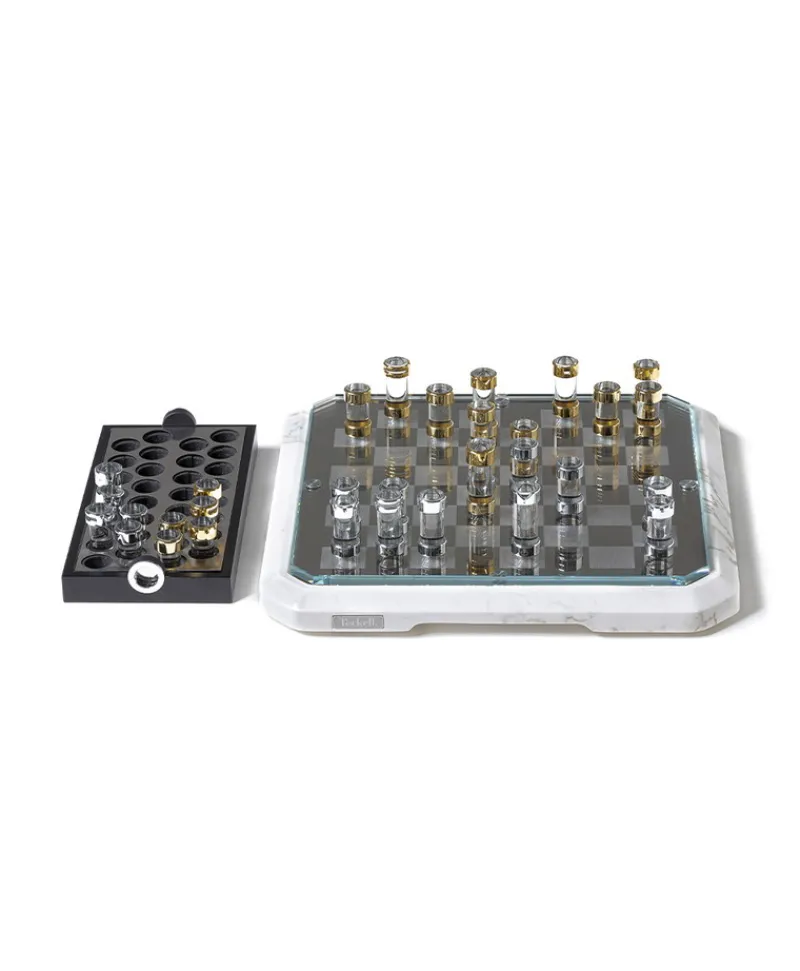 - Schachfiguren: aus gedrehten, extraklaren Zylindern aus Borosilikatglas – verziert mit 24-Karat-Gold und verchromtem Messing